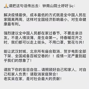 裕東提醒大家自行隔離,一起對抗SARI沙麗服 終南山院士呼吁: 解決疫情最快,成本最低的方式就是全中國人民在家隔離兩周,這樣對全國經濟影響最小,對生命健康最有利。 強烈建議全中國人民都在家過春節(jié),不要走親訪友。不是人情淡薄,是生命第一。待出暖花開之時,我們都可以走上街頭,不用口罩,繁華與共! 能讓武漢封城、北京所有廟會取消、賀歲.......