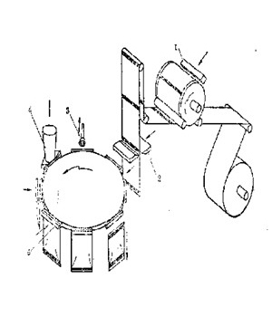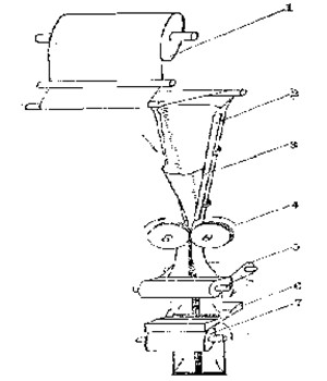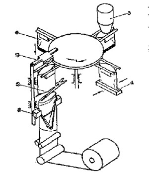 1-卷筒薄膜,2-象鼻成型器,3-加料斗,4-縱封輥, 1-加料管,2-翻領(lǐng)成型器,3-縱封輥,
