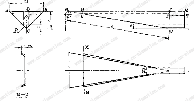 象鼻成型器的形成還需加裝薄膜護邊,以利控制包裝材料跑偏,常取護邊寬HK=m=10~20mm。見圖3.18所示。實際使用中又截去三角形板的GHK部分,減少成型器尺寸,在原三角形板的底邊G處設(shè)置一薄膜導(dǎo)輥,讓包裝材料經(jīng)這一導(dǎo)輥后直接拉上成型器的M—M截面處。