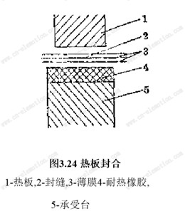 如圖3.24所示, 把加熱板加熱到一定的溫度,將要封合的塑料薄膜緊壓在一起,這是熱封原理與結構最為簡單的一種,封合速度較快,可恒溫控制,這種方法常應用于封合聚乙烯等復合薄膜,而對受熱易收縮與分解的薄膜,如各種熱收縮薄膜,聚氯乙烯等不宜應用。