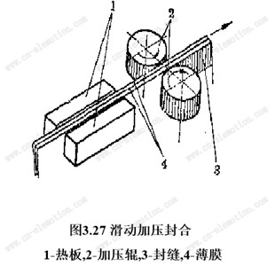 如圖3.27所示,薄膜首先通過一對熱板中間受到加熱(電加熱或空氣加熱),再經一對反向回轉輥輪加壓封合。本方法結構簡單,能適應那些熱變形大的薄膜的連續(xù)封合。