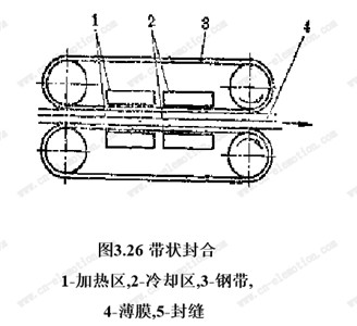 如圖3.26所示,一對相向回轉的金屬帶之間,夾著要封合的薄膜直線運動,在前進中通過鋼帶兩側加熱、加壓、冷卻。本結構稍為復雜,一般用于袋口的最后封口上,即能在運動中封合,以能適應受熱易變形的薄膜。