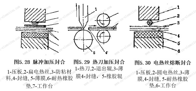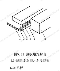 如圖3.29和3.30所示,靠加熱過的熱刀或電熱絲與薄膜接觸,使薄膜熔斷,并得到封口的一種方法,這種封縫的強度不大, 封口的外觀獨特, 其中圖3.29是恒溫加熱的熱刀熔斷封口,圖5.30是電熱絲熔斷封合,后者所得封縫強度較好,特別對熱收縮薄膜封口較有力