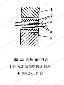 如圖5.32所示,薄膜用上、下電極壓著,外加高頻電源時,聚合物有感應阻抗而發(fā)熱熔化形成封縫,因是內部加熱,中心溫度較高而不過熱,所得封縫強度較高,對聚氯乙烯很適合,但不適用低阻抗薄膜。