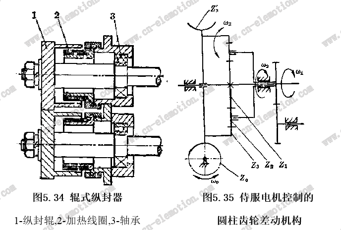 連續(xù)回轉(zhuǎn)的輥式縱封器如圖5.34所示,由縱封輥、加熱器、加熱線圈、固定與可調(diào)軸承等組成。