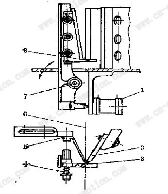 1-動力氣缸2-定刀3-動刀4-壓力彈簧5-引導(dǎo)板6-包裝料袋7-轉(zhuǎn)軸支承8-動刀定位塊