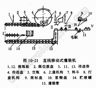 2.直線移動(dòng)式灌裝機(jī) 空瓶經(jīng)傳送盤、限位撥盤送到推瓶處1,推瓶板每隔一定時(shí)間把一定數(shù)量的空瓶推向灌裝位置,打開閥門進(jìn)行成排灌裝,然后送出。整個(gè)生產(chǎn)線分為五個(gè)工位:工位Ⅰ為定量灌裝,工位Ⅱ?yàn)樯仙w,工位Ⅲ為擰緊蓋,工位Ⅳ為貼商標(biāo),工位Ⅴ為裝盒裝箱。