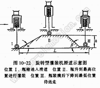 1.旋轉(zhuǎn)式灌裝機(jī) 它主要由輸送機(jī)構(gòu)、撥人撥出機(jī)構(gòu)、升降機(jī)構(gòu)、旋轉(zhuǎn)盤、灌裝頭和貯液箱等組成。其工作過程見圖10-19。轉(zhuǎn)盤的側(cè)視簡(jiǎn)圖,見圖19-20.