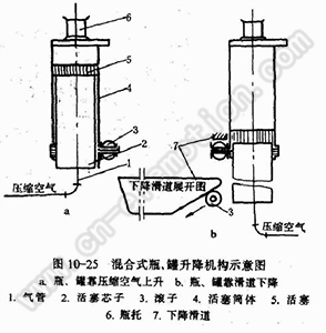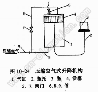 壓縮空氣式升降機(jī)構(gòu)克服了滑道式升降機(jī)構(gòu)的缺點(diǎn),當(dāng)發(fā)生故障時(shí),瓶被卡住,壓縮空氣好似彈簧一樣被壓縮,這時(shí)瓶托不再上升,故不會(huì)被擠壞,但這種機(jī)構(gòu)下降時(shí)沖擊力較大。