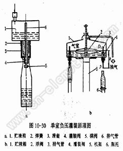 (三)負壓灌裝(又稱真空灌裝)它是在低于大氣壓力的條件下進行灌裝,即先建立容器內(nèi)的真空,然后靠液體的自重或靠液料箱與容器問的壓力差進行灌裝??煞譃閱问液碗p室兩種負壓灌裝方法。