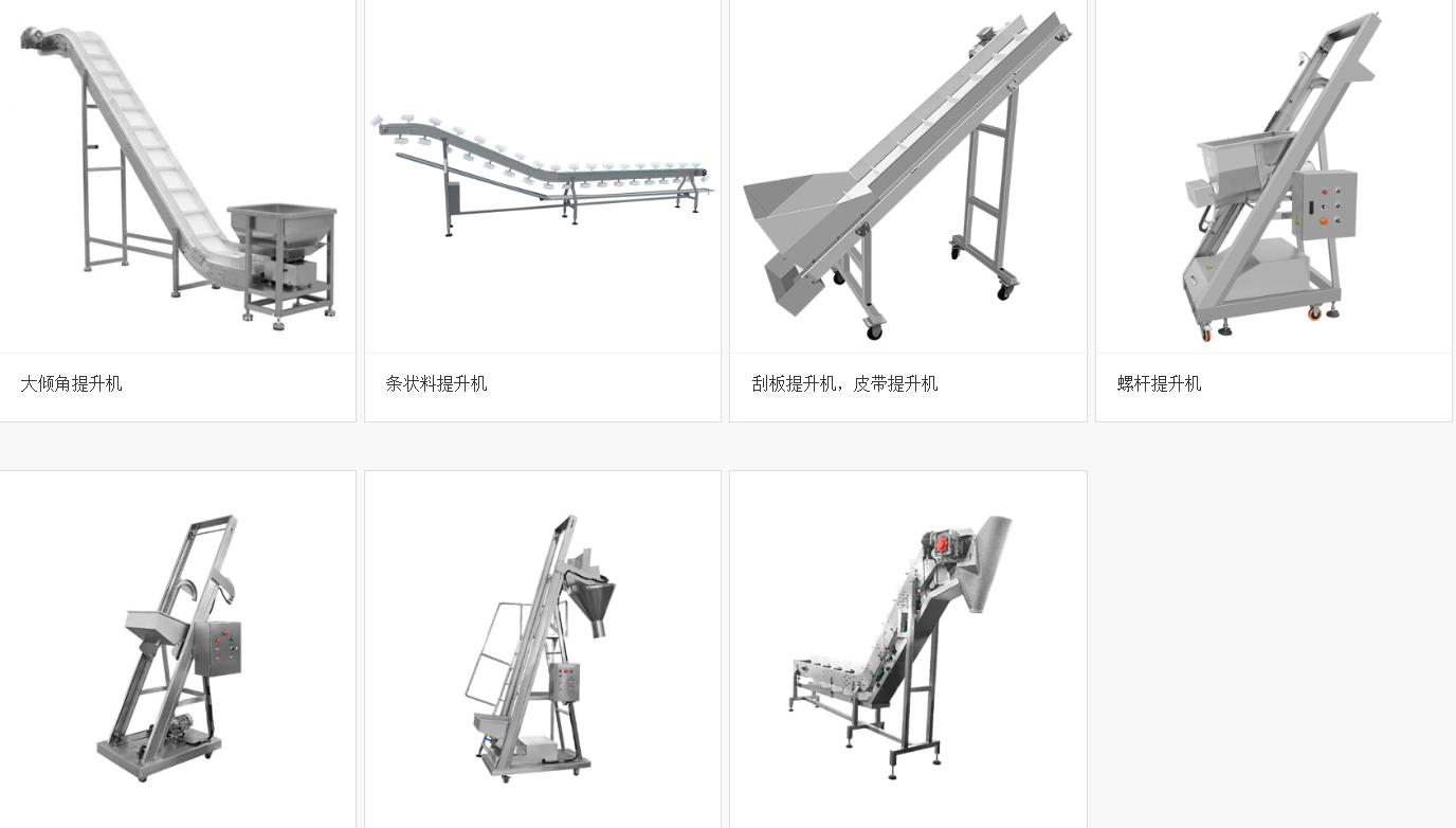 給袋式包裝機(jī)的送料機(jī)構(gòu)是將物料輸送至電子計(jì)量裝置,用于計(jì)量和放料,當(dāng)計(jì)量裝置儲料箱內(nèi)沒有足夠的物料時(shí),送料機(jī)構(gòu)就將物料送至儲料箱。常見的物料輸送機(jī)構(gòu)有:斗式提升機(jī)、皮帶式送料機(jī)、螺旋送料機(jī)、滾筒送料機(jī)、刮板式送料機(jī)等,如圖所示。