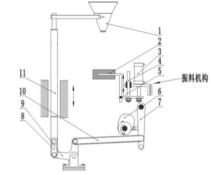 1-料斗 2-振料棒 3-氣缸 4-導(dǎo)向棒 5-緊固螺釘 6-凸輪 7-擺桿 8、9、10、11-連桿