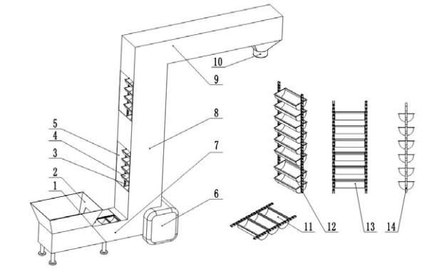 1-機座 2-儲料器 3-環(huán)鏈 4、11~14-料斗 5-檢視口 6-驅(qū)動裝置 7、8、9-送料系統(tǒng) 10-料口