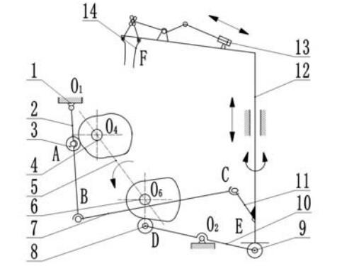 1-機架 2-擺桿 3-滾子 4-撐袋旋轉(zhuǎn)凸輪 5-主軸 6-撐袋升降凸輪 7-連桿 8-滾子 9-滾子連桿 10-擺桿 11-固連連桿 12-撐袋機械手臂 13-氣缸 14-撐袋器夾