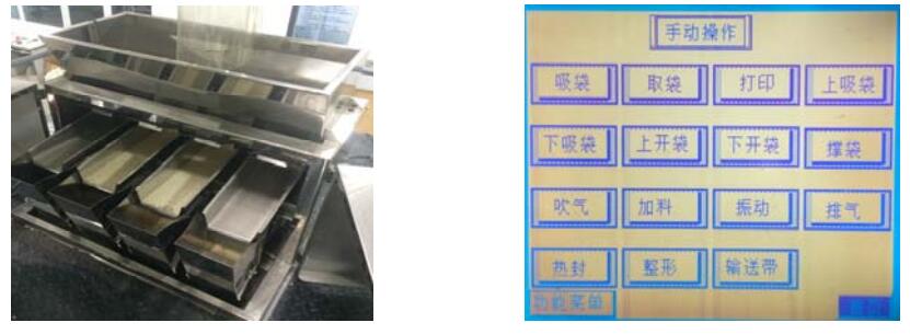 3. 點(diǎn)擊觸摸屏用戶登錄界面,進(jìn)入操作界面后,設(shè)置主電機(jī)轉(zhuǎn)速,點(diǎn)擊 PLC“手動(dòng)操作”界面,如圖 6.9 所示,在畫面中可以看到“吸袋”、“取袋”、“上開(kāi)袋”、“下開(kāi)袋”、“撐袋”、“吹氣”、“加料”、“排氣”、“熱封”、“整形”等按鍵。當(dāng)機(jī)器處于停機(jī)狀態(tài)下點(diǎn)擊按鍵可以方便檢查相應(yīng)元件是否工作正常,進(jìn)行人工調(diào)試。