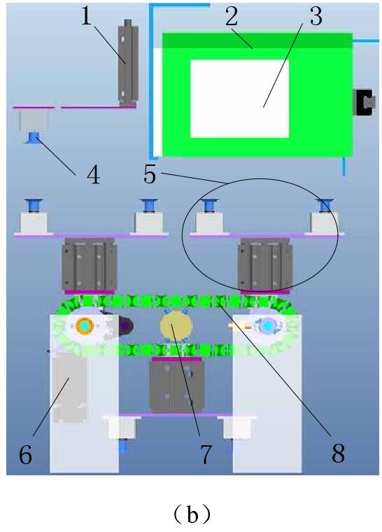 1-氣缸; 2-袋庫; 3-預(yù)制袋; 4-開袋吸盤組件; 5-取袋吸盤組件; 6一電機; 7-氣滑環(huán); 8-滾子鏈