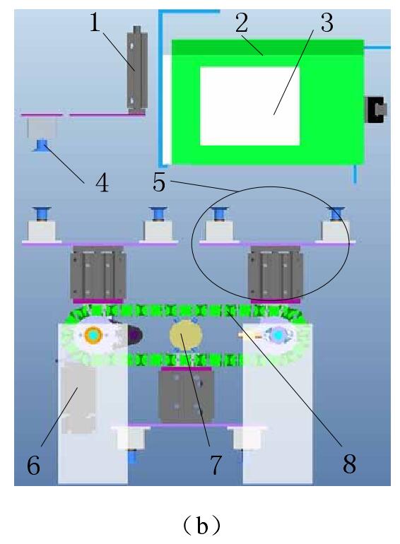 給袋式包裝機(jī)取袋裝置方案的選擇。兩種取袋裝置方案的比較,方案(a)主要利用真空吸盤將預(yù)制袋從袋庫中取出,并通過往復(fù)運(yùn)動(dòng)的氣缸傳送預(yù)制袋。與方案(a)傳送預(yù)制袋方式不同,方案(b) 是在真空吸盤將預(yù)制袋從袋庫中取出之后,經(jīng)過鏈傳動(dòng)把預(yù)制袋運(yùn)送到開袋工位,并且鏈傳動(dòng)組件上同時(shí)設(shè)置有三個(gè)吸盤組件,在開袋的同時(shí)完成取袋工作。顯而易見,方案(a)原理與結(jié)構(gòu)簡單,但是由于氣缸的往復(fù)運(yùn)動(dòng)的運(yùn)送方式,致使送袋效率低,雖然方案(b)較之于方案(a)結(jié)構(gòu)略有些復(fù)雜,但是也是可以接受的結(jié)構(gòu),最重要的是方案(b)取袋效率高,取袋效率至少是方案(a)的一倍。綜合考慮各因素,取袋裝置的方案定為方案(b)。