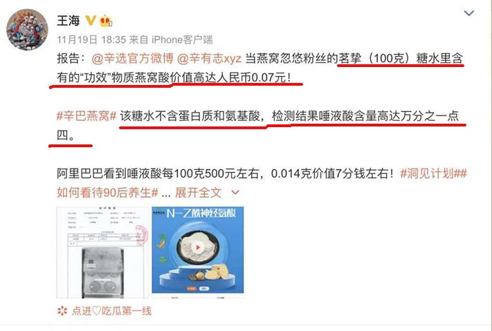 剛開始,我還以為“辛巴事件”只是生活中普通的不能再普通的小新聞,但是隨著以辛巴、燕窩為關(guān)鍵詞的熱搜,頻繁登上抖音、新浪微博、百度風(fēng)云榜等熱搜,我才發(fā)現(xiàn)這事可能沒我想象中的那么簡單。于是,我去網(wǎng)絡(luò)相關(guān)媒體了解了一下,大致事情經(jīng)過是這樣的:在辛巴公司辛選旗下的主播辛有志,在推廣和售賣一款即食燕窩近十天后,一位自稱產(chǎn)品消費者的dy用戶在dy平臺發(fā)布了一個質(zhì)疑該產(chǎn)品全是水、沒有內(nèi)容物的視頻,隨后此事被迅速推上抖音熱點。后來,職業(yè)打假人王海發(fā)布了一份檢測報告,稱辛選燕窩就是糖水,微博話題#辛巴所售燕窩被王海檢測為糖水#登上熱搜。11月27日,辛巴承認所售燕窩產(chǎn)品存在問題并提出替品牌方先行賠付方案,截至12月6日中午已向27270名消費者完成近2400萬元的賠付。