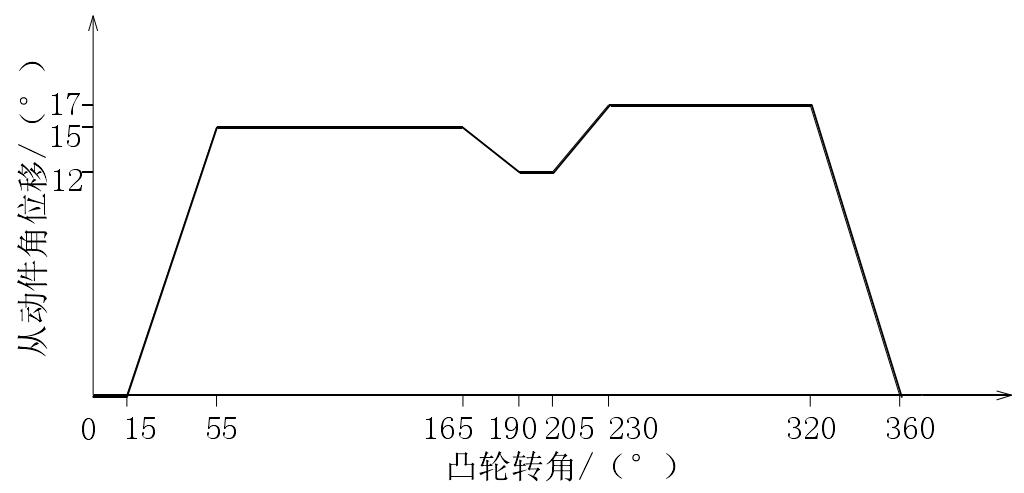 基于圖1所示給袋式包裝機(jī)的套袋裝置所處的位置進(jìn)行描述,撐開凸輪機(jī)構(gòu)從動擺桿需滿足如下運動要求:當(dāng)凸輪轉(zhuǎn)過15"時,擺桿靜止,轉(zhuǎn)向齒輪機(jī)構(gòu)使撐開凸輪機(jī)構(gòu)所在平面逆時針轉(zhuǎn)動10°與豎直方向平行,撐袋支板探入已經(jīng)開口的預(yù)制袋內(nèi)。凸輪繼續(xù)轉(zhuǎn)過40°,擺桿擺動15°,使撐袋桿打開,袋口被撐開。凸輪再繼續(xù)轉(zhuǎn)過110°時,擺桿保持撐袋狀態(tài),期間,轉(zhuǎn)向機(jī)構(gòu)先帶動撐開機(jī)構(gòu)順時針轉(zhuǎn)動90°,然后提升裝置將撐開機(jī)構(gòu)提升距離h,套袋裝置完成套袋動作。凸輪繼續(xù)轉(zhuǎn)過25°,擺桿回擺3°,撐袋桿微微合攏,使撐袋支板與袋口脫離,準(zhǔn)備退出袋口。凸輪再繼續(xù)轉(zhuǎn)過15*,擺桿靜止,轉(zhuǎn)向機(jī)構(gòu)帶動撐開機(jī)構(gòu)順時針轉(zhuǎn)動10°,撐袋支板從袋口退出,完成退袋動作。凸輪繼續(xù)轉(zhuǎn)過25°,擺桿擺動5°,兩擺桿再次張開準(zhǔn)備回初始位置。凸輪再繼續(xù)轉(zhuǎn)過90°時,擺桿不動,在提升裝置帶動下,撐開機(jī)構(gòu)向下運動h至最低位置。最后凸輪再繼續(xù)轉(zhuǎn)過40°時,擺桿回擺17° ,轉(zhuǎn)向機(jī)構(gòu)帶動撐開機(jī)構(gòu)逆時針轉(zhuǎn)動90°,撐開機(jī)構(gòu)回到初始位置。