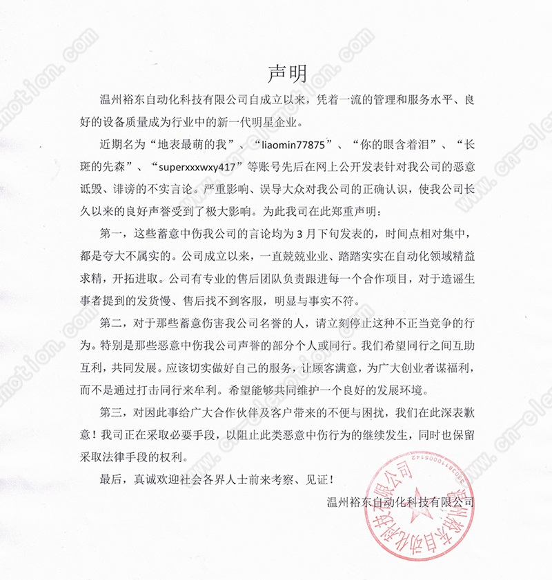 近期名為“地表最萌的我”、“liaomin77875”、“你的眼含著淚”、“長斑的先森”、“superxxxwxy417”等賬號先后在網(wǎng)上公開發(fā)表針對我公司的惡意詆毀、誹謗的不實言論。嚴(yán)重影響、誤導(dǎo)大眾對我公司的正確認識,使我公司長久以來的良好聲譽受到了極大影響。為此我司在此鄭重聲明: