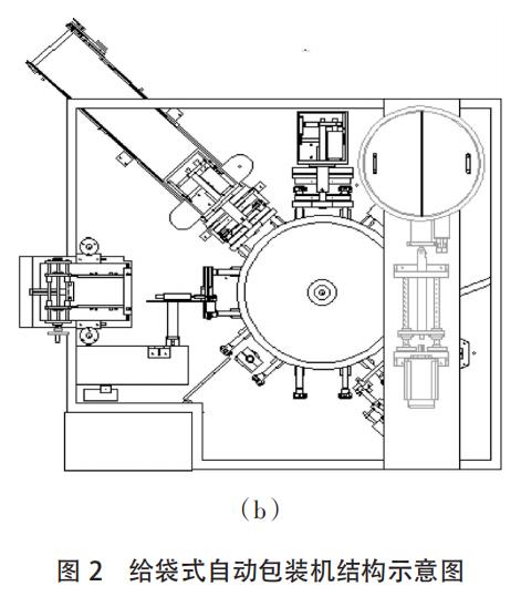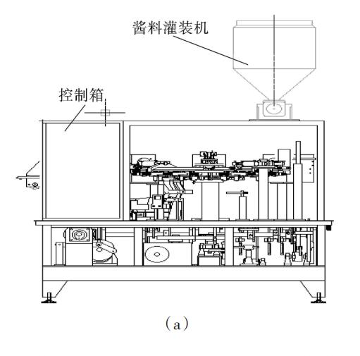 圖2為給袋式真空包裝機結構示意圖,本次選型采用8工位給袋式真空包裝機(傳統(tǒng)的為6工位)。該機有設計2個注料填充工位,可實現(xiàn)醬液混合物灌裝、醬液分離分別灌裝,并改進為專用注料槍,控制灌裝過程中注料槍本身的漏油及注料槍底部的滴油滴料現(xiàn)象,使包裝袋在封口前袋口干凈整潔,保證封口時袋口不夾料、不含雜質;給袋式自動包裝機采用預制袋包裝,增加2個封口工位,一次熱封口,一次熱封口冷卻,主要作用是對封口進行加固、成型,彌補只有一次熱封口時如沒有封好就造成直接漏油、封口皺褶等現(xiàn)象。