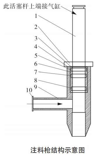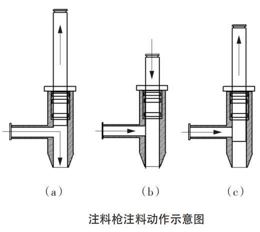 圖1是給袋式真空包裝機(jī)的注料槍結(jié)構(gòu)示意圖是生產(chǎn)靜止時(shí)的狀態(tài),當(dāng)主機(jī)控制發(fā)出注料信號(hào)時(shí),如圖2(a)注料槍活塞桿在氣缸帶動(dòng)下,向上移動(dòng),使注料槍體下料與進(jìn)料管形成通道,注料泵動(dòng)作,物料通過注料槍灌裝入包預(yù)制包裝袋內(nèi);注料泵完成一次打料動(dòng)作后,注料槍活塞向下移動(dòng),如圖2注料動(dòng)作示意圖(b),活塞桿將注料槍體下端的物料全部推入包裝袋內(nèi),并封住進(jìn)料管口,為了防止活塞桿下端粘料,可根據(jù)需要在活塞桿中間開孔,上端進(jìn)氣,一直吹向最下端,將活塞桿下端粘的物料吹掉,從而使注料槍不滴油滴料;為了防止活塞桿與注料槍體之間粘料,而掛在注料槍最下端,包裝袋走過時(shí)污染到袋口,設(shè)計(jì)注料活塞桿向上移運(yùn)一定距離,但不能超過進(jìn)料管口(保證進(jìn)料口是封住的),如圖2注料槍注料動(dòng)作示意圖2(c)。灌裝注料完成一次動(dòng)后注料槍下端是空出一段的,等待下一次動(dòng)作時(shí)活塞桿再向上移動(dòng)到圖2(a)狀態(tài)。