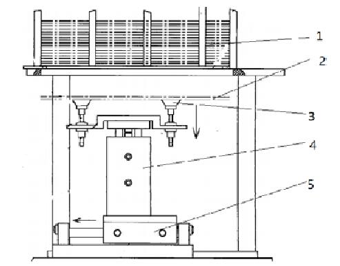 1-貯袋庫; 2-預(yù)制袋; 3-真空吸盤; 4-取袋氣缸; 5-運袋氣缸