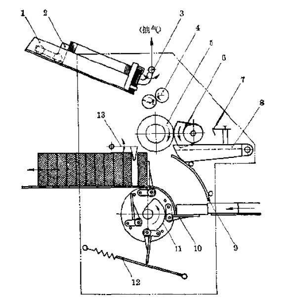 1-片材庫; 2-配重; 3- 擺動吸盤; 4輸送輪; 5-真空吸鼓; 6- 涂膠輪; 7-刮膠板;8-膠水庫; 9-折紙板; 10-接包片輪; 11-調整板; 12-緩沖板; 13-擺動折疊角