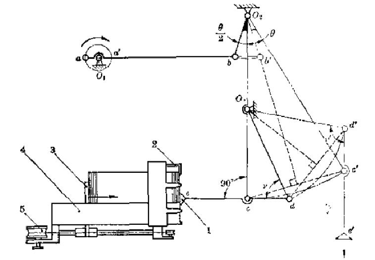 由圖中可以看出整個裝置相對簡單,只是通過組合的機(jī)構(gòu)傳動模式來保證將在片材庫中豎直的片材供送到水平位置。而對于這種水平的片材庫,其主要特點(diǎn)是通過渦卷彈簧5來提供吸盤吸取片材的背壓力。相對于圖2-4中有略微傾斜的片材庫來說,這樣的片材庫就不能使用加配重的方式來提供背壓力了。用這樣的方式就使片材庫的長度收到了限制,因?yàn)楫?dāng)片材被消耗的同時渦卷彈簧所能提供的背壓力就會減小,這樣當(dāng)過長時就會出現(xiàn)片材庫被裝滿時臥卷彈簧的被壓力過大而使取片真空吸盤不能夠提供足夠的真空吸力將片材拉出,當(dāng)片材消耗過多時,臥卷彈簧不能提供足夠的背壓力。另外一方面為了防止渦卷彈簧的推力將片材從片材庫中直接推出,就需要在片材庫的頂部加上頂端限位卡片2,對于側(cè)面取片的片材供送裝置都有這個要求。這種片材供送裝置對于預(yù)制袋來說是同樣適用的,具體使用時的要求也基本相同,其主要問題還是由于連桿機(jī)構(gòu)的往復(fù)間歇運(yùn)動不能使取片速度得到很大的提升。