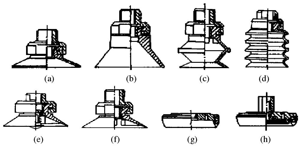(a)普通型真空吸盤; (b)重載型真空吸盤; (c)短波紋型真空吸盤;(d)長波紋型真空吸盤; (e)帶開關(guān) 真空吸盤; (f)表面限位真 空吸盤; (g)蜂窩橡膠唇邊真空吸盤; (h)最小轉(zhuǎn)換周期真空吸盤