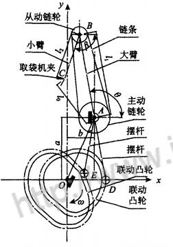 給袋式包裝機(jī)取袋機(jī)構(gòu)是由 2 自由度 的平面連桿開式鏈機(jī)構(gòu)和聯(lián)動(dòng)凸輪機(jī)構(gòu)組成的封閉型組合機(jī)構(gòu) ,末端執(zhí)行器選擇機(jī)械二指夾持式機(jī)構(gòu)。給袋式真空包裝機(jī)取袋機(jī)械手機(jī)構(gòu)簡(jiǎn)圖見圖 。其中大臂臂長(zhǎng)為 ,,小臂臂長(zhǎng)為 12,取袋末端執(zhí)行器 C點(diǎn)到回轉(zhuǎn)中心 的距離為 /o, 與 分別為大、小臂與 軸所夾夾角。在取袋機(jī)構(gòu)中聯(lián)動(dòng)凸輪作為原動(dòng)件,取袋機(jī)構(gòu)在聯(lián)動(dòng)凸輪的作用下推動(dòng)擺桿帶動(dòng)鏈輪機(jī)構(gòu)運(yùn)動(dòng) ,其 中小臂與從動(dòng)鏈輪、主動(dòng)鏈輪與擺桿固連在一起 ,鏈輪轉(zhuǎn)動(dòng)實(shí)現(xiàn)小臂桿的擺動(dòng) ,這樣使得末端機(jī)械手實(shí)現(xiàn)取送袋運(yùn)動(dòng)。凸輪旋轉(zhuǎn) 1個(gè)周期 ,機(jī)械手重新取袋 ,循環(huán)作業(yè) 。