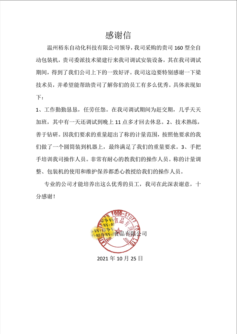溫州裕東自動(dòng)化科技有限公司領(lǐng)導(dǎo),我司采購(gòu)的貴司160型全自動(dòng)包裝機(jī),貴司委派技術(shù)梁建行來我司調(diào)試安裝設(shè)備,其在我司調(diào)試期間,得到了我們公司上下的一致好評(píng)。我司這邊要特別感謝一下梁技術(shù)員,并希望能幫助貴司了解你們的員工有多么優(yōu)秀。具體表現(xiàn)如下:
