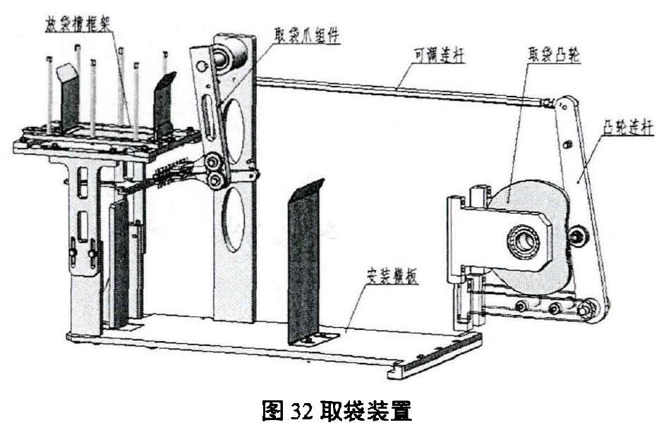 給袋式包裝機取袋裝置的作用是將包裝袋由袋庫取出送至第--工位,主要由取袋爪組件、安裝橫板、放袋槽框架、取袋凸輪、凸輪連桿、關(guān)節(jié)軸承、可調(diào)連桿等組成。