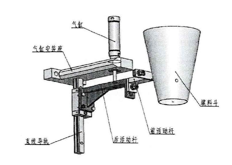 如圖所示,填料裝置主要由氣缸安裝座、氣缸、直線導軌、后活動桿、前活動桿和填料斗等組成,其主要功用是在設備工作中,實現(xiàn)填料進給。