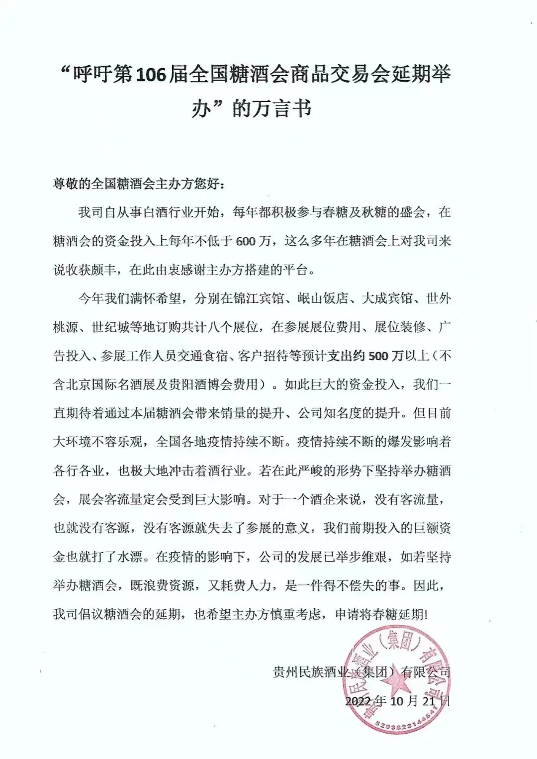 酒企則上演了一場(chǎng)聲勢(shì)浩大的公車上書。上百家酒企通過萬言書接龍方式,呼吁暫停舉辦今年的冬糖會(huì),以減少自身參展損失。