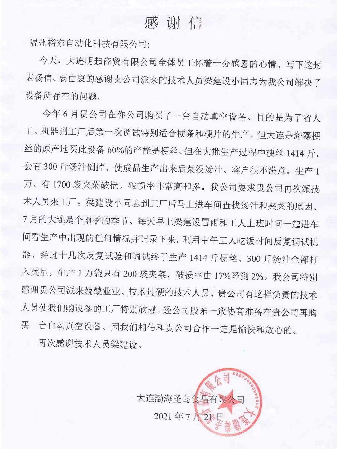服務(wù)只有起點,滿意沒有終點 感謝客戶的認可,您的滿意才是我們裕東的追求! 選擇裕東,走向成功! 溫州裕東自動化科技有限公司: 今天,大連XX有限公司全體員工懷著十分感恩的心情、寫下這封表揚信、要由衷的.......