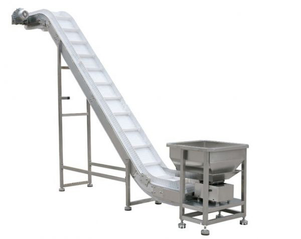 大傾角提升機(jī)適用于帶水份的顆粒狀物體,如牛肉丸、魚丸、牛雜等產(chǎn)品,使用完之后沖洗方便。