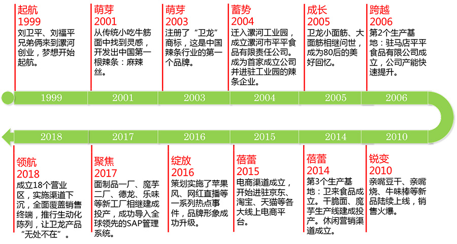 衛(wèi)龍創(chuàng)辦于1999年,是集研發(fā)、生產(chǎn)、加工和銷售為一體的現(xiàn)代化休閑食品品牌。