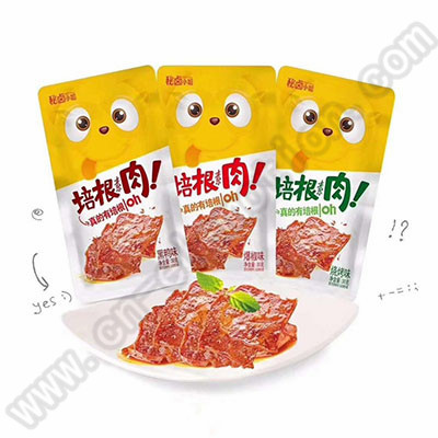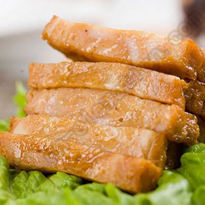 培根系由英語“Bacon”譯音而來,其原意是煙熏肋條肉(即方肉)或煙熏咸背脊肉。培根是西式肉制品三大主要品種(火腿、灌腸、培根)之一,其風(fēng)味除帶有適口的咸味之外,還具有濃郁的煙熏香味。培根外皮油潤呈金黃色,皮質(zhì)堅(jiān)硬,用手指彈擊有輕度的“卟卟”聲;瘦肉呈深棕色,質(zhì)地干硬,切開后肉色鮮艷。